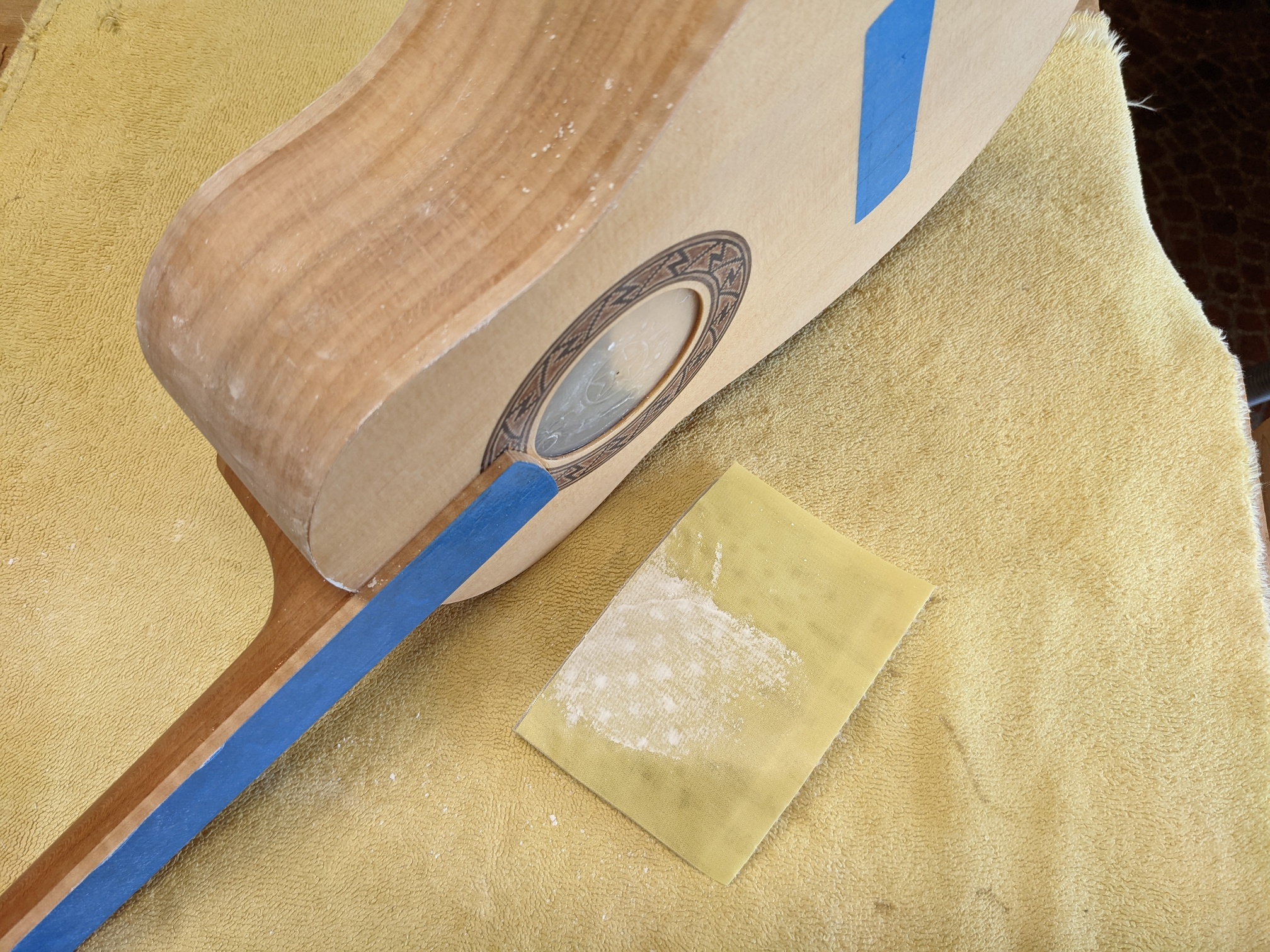 This sandpaper has really been helpful in changing my attitude toward finishing – I actually now enjoy it since I’m spending significantly less time sanding. The only downside of Super Assilex is the cost – the starter kit runs about $80 on Amazon for 5 double sheets of each the 5 grits from 600 to 1500, plus the sanding block and pads. I added to the finishing kit by purchasing some 320 grit sheets for use in sanding between coats and initial leveling. The single-grit packages are a little less expensive, at $50 for 25 double sheets, but that still comes out to about $1 per sanding-block-sized piece of sandpaper. On the other hand, each half-sheet of the 600 through 1500 grit seems to last for at least a couple of guitars. I use about one 320 grit half-sheet per guitar since it does the main work of leveling; given my spraying prowess, there’s always lots of that to do. Super Assilex is also available in sanding disc form for power sanding, but given how fast it cuts by hand I’m not sure I’d have the courage to try those.