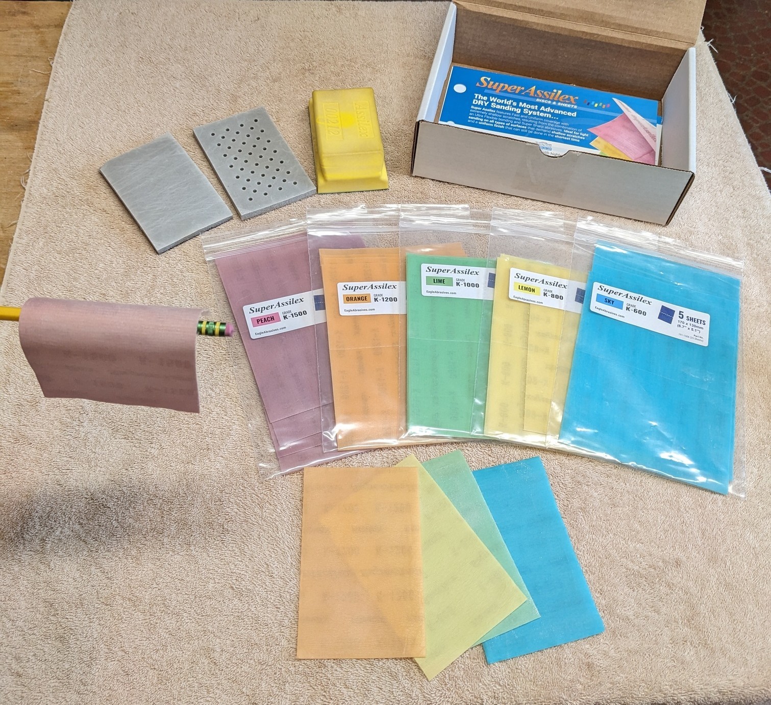 What I discovered instead was something way better – a new type of sandpaper called Super Assilex, from Eagle Abrasives, Inc. I hesitate to call it sandpaper because the abrasive sheets aren’t paper – they’re some sort of very thin, soft, flexible polymer. As such, there aren’t any stiff edges or corners to dig in and leave scratches. In fact, the sheets are so thin that you really need to use a backer to effectively hold them. The Starter Kit contains a selection of grits from 600 through 1500, and a sanding block and backing pads with a hook and loop type surface for attaching the sheets. Figure 1 shows the starter kit, with one of the sheets of “paper” draped over a pencil to show how flexible it is.